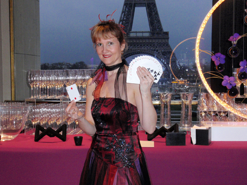 Elle anime tous types d'événements : autour d'une table de dîner ou debout lors d'un cocktail, elle présente des tours parfaitement maîtrisés avec le " petit plus féminin " : sourire, sensibilité, émotion, grâce et originalité ! Elle se produit trés régulièrement à Disneyland Paris.